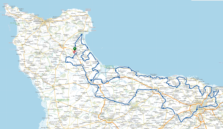 Le parcours de notre "Juin 1944, la Liberté" est un parcours qui relie les points d'intérêts historiques du débarquement et les et culturels de la Manche (le département) en empruntant le maximum de petites routes.